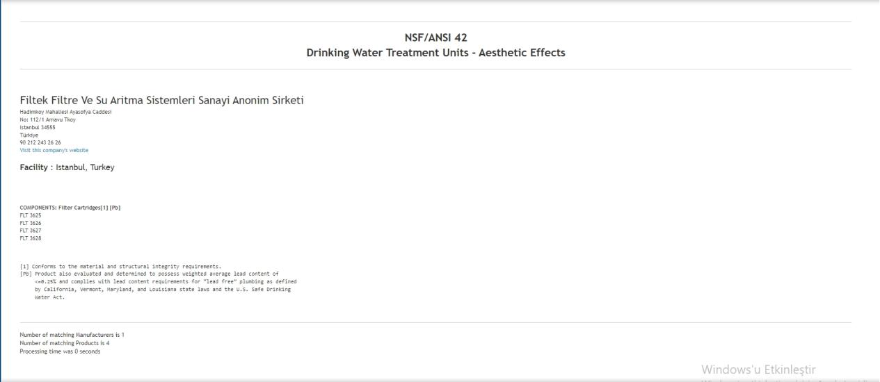 SİSTEMDE BULUNAN TÜM PARÇALAR NSF ONAYLIDIR AŞAĞIDA SİZLER İÇİN NSF BELGESİNİ SUNMAKTAYIZ.